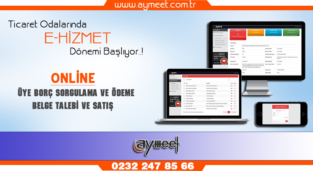 Aymeet Ticaret Odaları - Borsaları E-Hizmet Portalı sistemiyle, üye borç bilgilerini sorgulamak ve üye aidatlarını toplamak için üyelerin odaya gelmesi beklemek veya oda çalışanlarının üyelere giderek tahsilat gerçekleştirmesi sona eriyor. Ayrıca yine